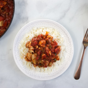 - Sauté chicken pieces in the oil until no longer pink. Remove and keep warm. In the same skillet, sauté the onion, green pepper, and celery in the remaining oil until tender. Stir in the tomatoes, broth, tomato paste, and seasonings.