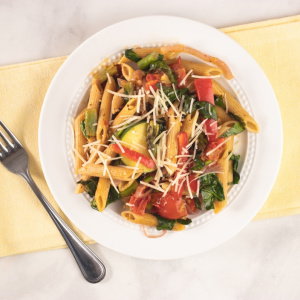 - Add pasta to sauté pan and toss with vegetables.