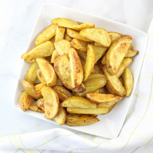 - Wash potatoes and slice into wedges.